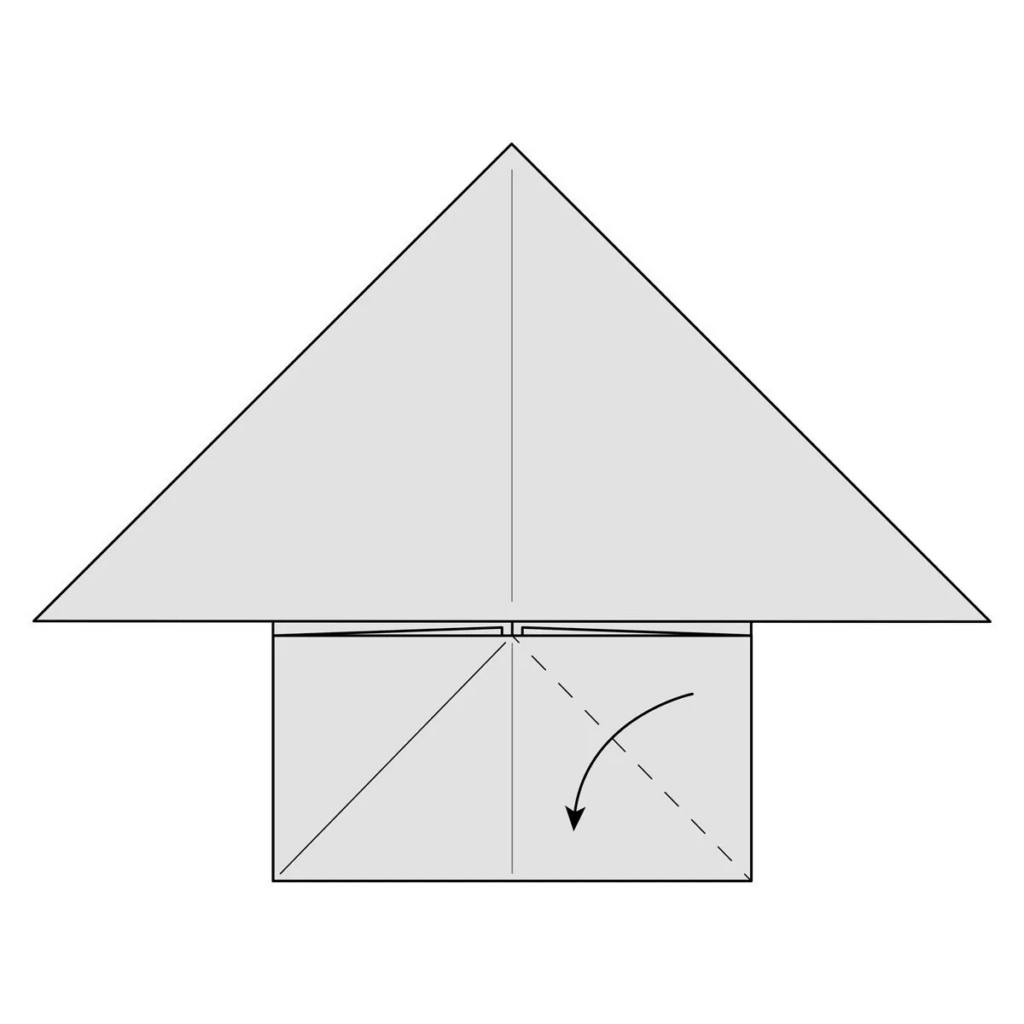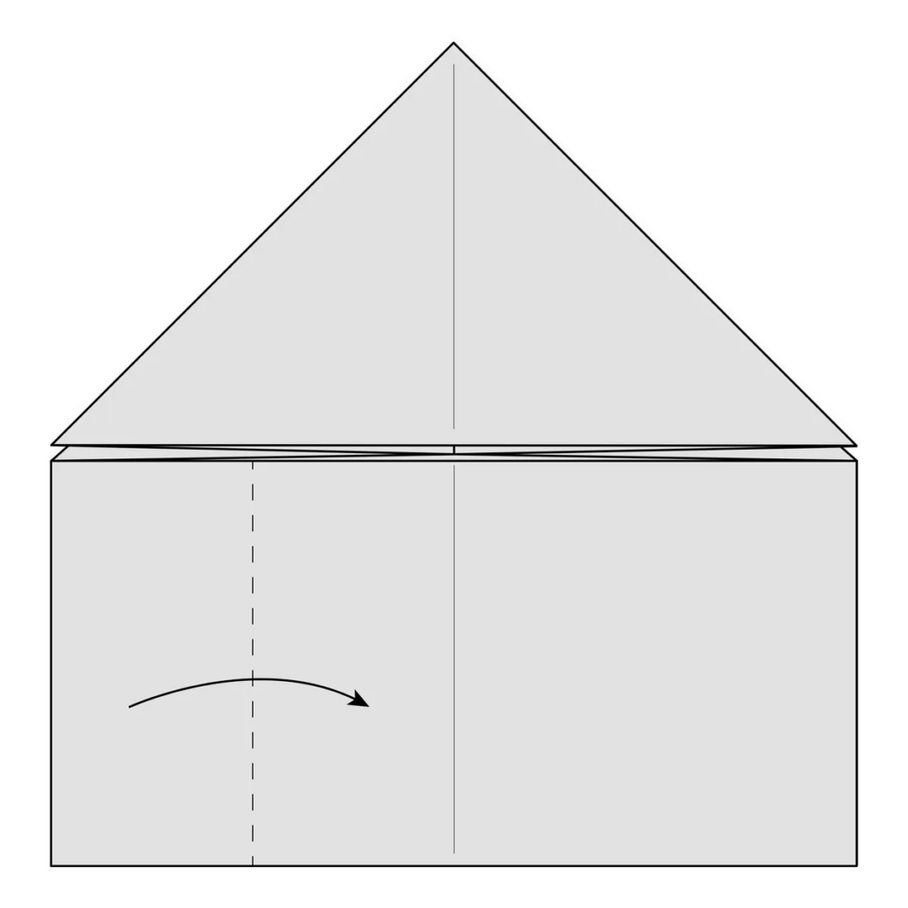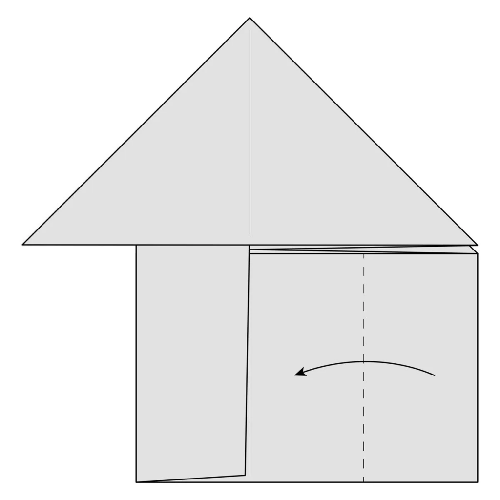 Сложите правую сторону бумаги к центру по пунктирной линии. Снова не сгибайте верхний треугольник, а спрячьте бумагу за ним.