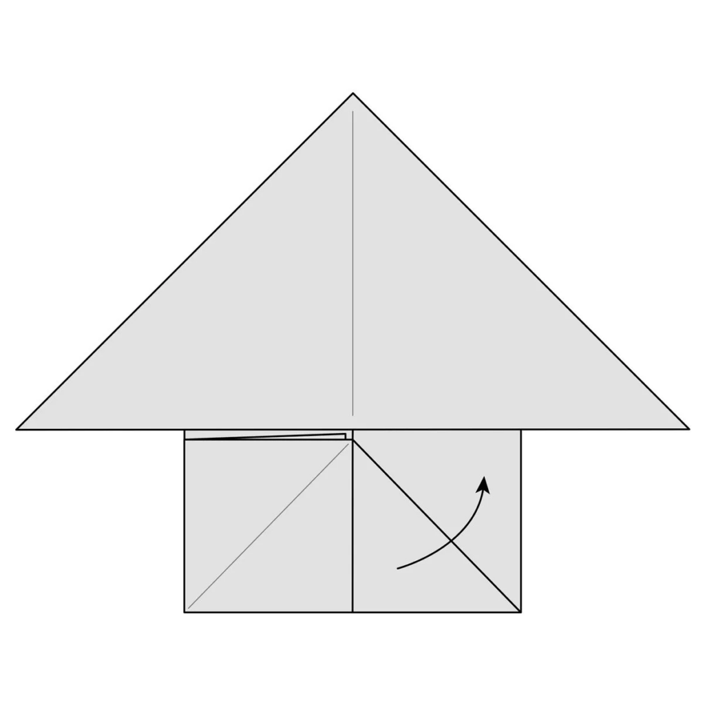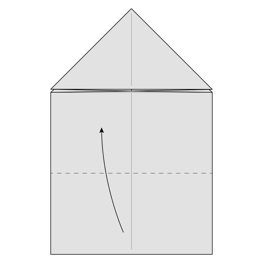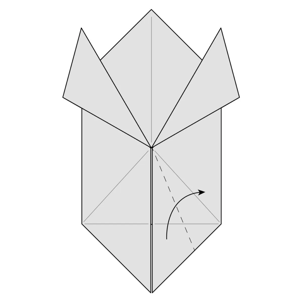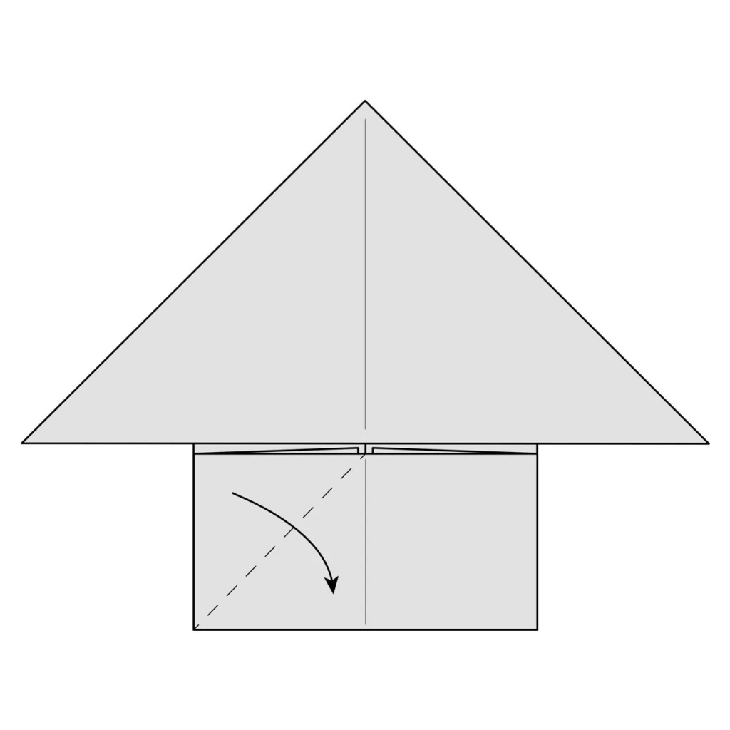 Сложите правую сторону бумаги к центру по пунктирной линии. Снова не сгибайте верхний треугольник, а спрячьте бумагу за ним.