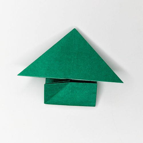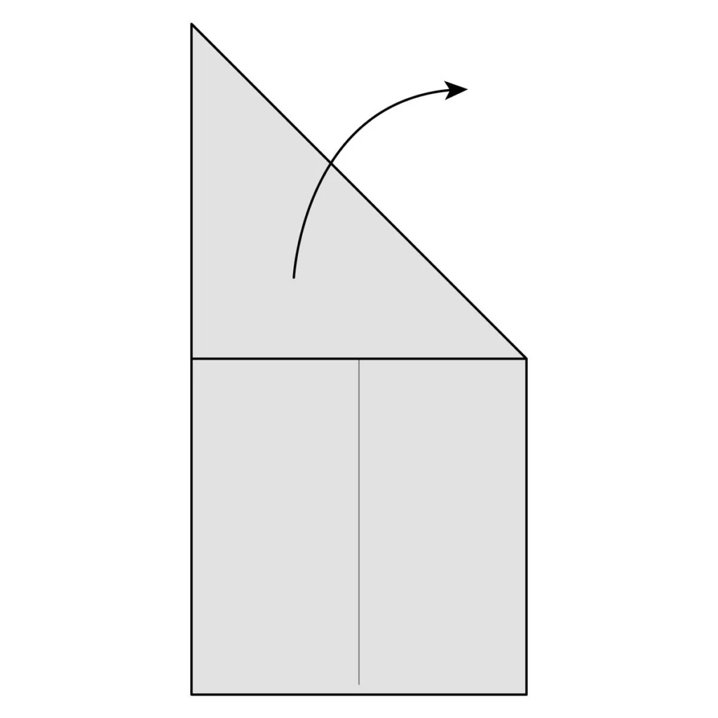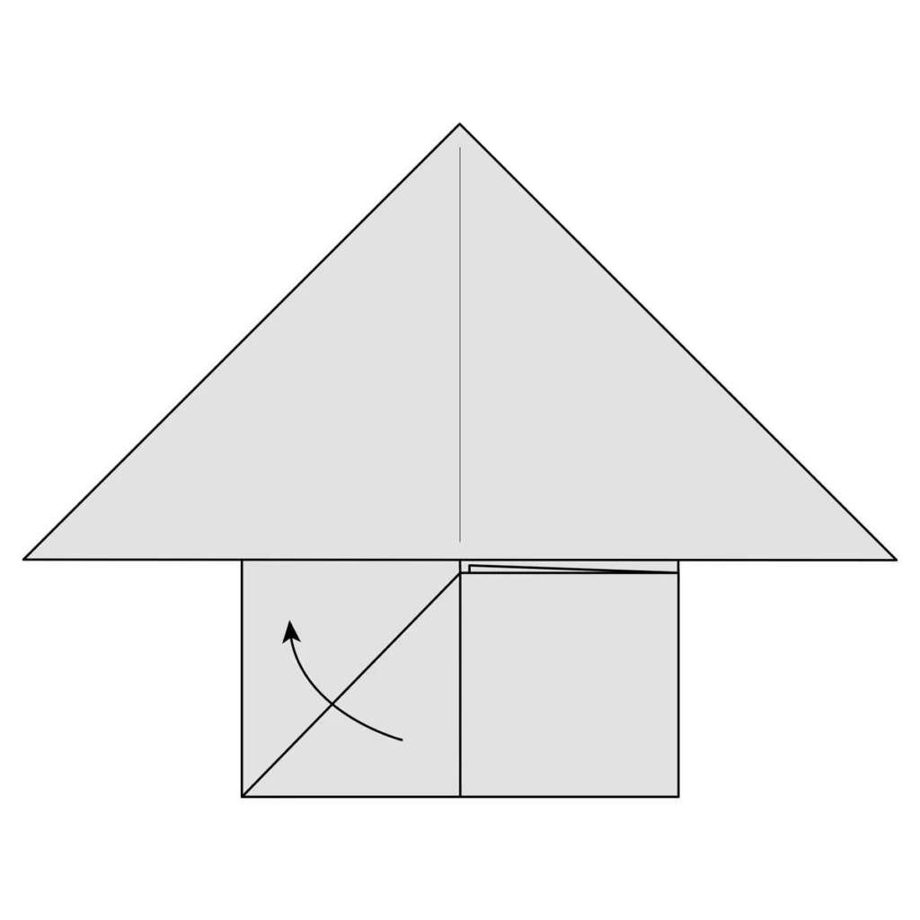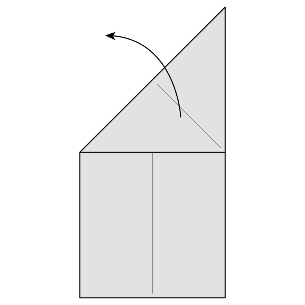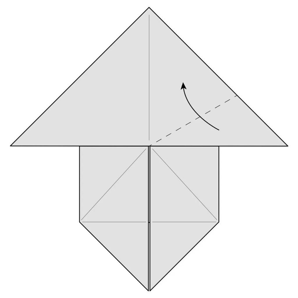 Сложите левую сторону бумаги к центру по пунктирной линии. Верхний треугольник при этом не сгибайте — бумага должна спрятаться за ним.