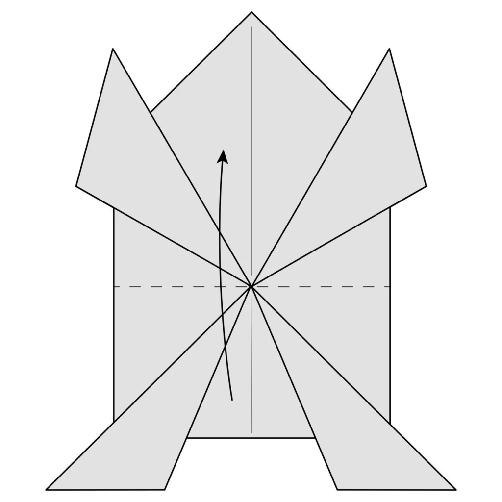 Сложите верхнюю правую часть бумаги вверх по пунктирной линии. Это будет одна из передних лапок лягушки. Не переживайте об угле сгиба — достаточно, чтобы форма была похожа на ту, что показана в следующем шаге.