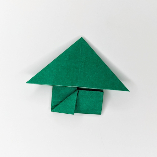 Сложите нижнюю правую часть бумаги вверх по пунктирной линии. Это будет одна из задних лапок. Угол сгиба не обязательно должен быть идеальным, главное — приблизительная форма, как на следующем шаге.